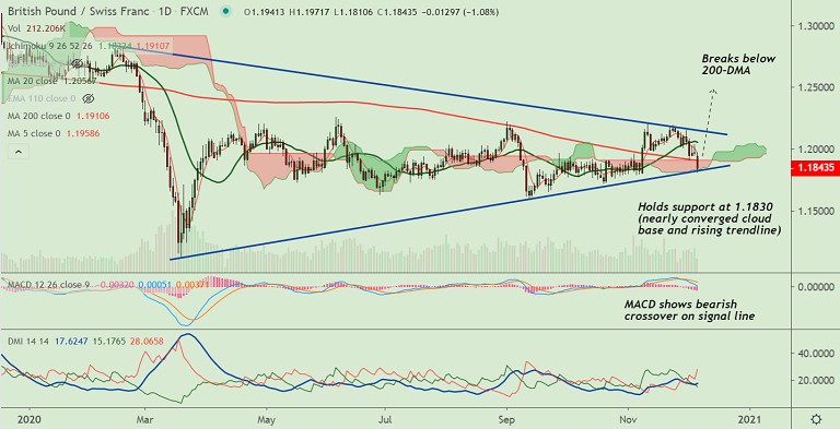 GBP/CHF was trading 1.11% lower on the day at 1.1839 at around 13:10 GMT, outlook is turning bearish.