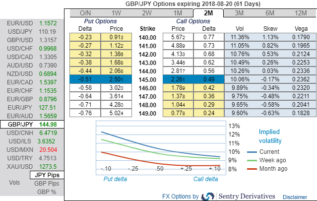The aggressive volatility investors want to capture GBP should consider buying ATM put instruments and/or being long of the smile convexity, against ATM volatility. Thus, ATM strikes are perceived to be more conducive than the OTMs.