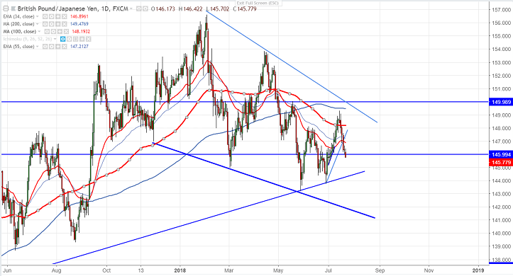 - GBP/JPY is trading weak for fifth consecutive days and has lost more than 350 points in previous week. GBP recovered sharply from low of 1.2955 of almost 180 pips on broad based US dollar selling after Trump’s criticism on fed rate hike and to impose fresh round of trade tariff of $505 billion in Chinese goods imported to the US.Pound sterling was trading weak after weaker than expected UK macro data would dampen the chance of rate hike by BOE in August month. The pair hits intraday low of 145.70 and is trading around 145.80.
