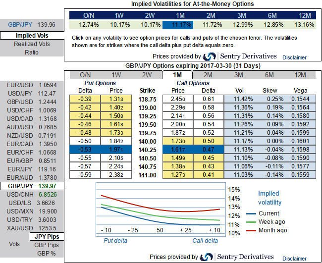But further GBPJPY weakness and/or abrupt upswings suggests building a directional and volatility patterns at the same time: the value of OTM puts would unlikely to rise significantly as the IVs do not seem to be favoring these distant strikes. We, therefore, recommend buying a 1m2w IV skews and risk reversal with ATM options.