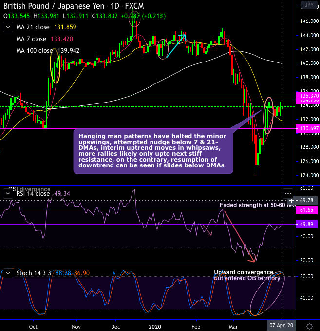 Hanging man patterns have occurred at 133.693 and 134.456 levels, these bearish patterns have halted the minor upswings and attempted nudge below 7 & 21-DMAs. Consequently, the interim uptrend moves in whipsaws, for now, more rallies seem likely only up to next stiff resistance zone 134 -135 levels as stated above.