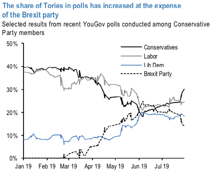 With the vote split the way it is currently, it is less easy to predict seat distribution and hence the situation remains fluid. For markets, either outcome—an election of a Conservative party pushing an uncompromising hard Brexit or the possibility of a Labour administration if Johnson’s strategy fails—presents an unfavorable outcome.