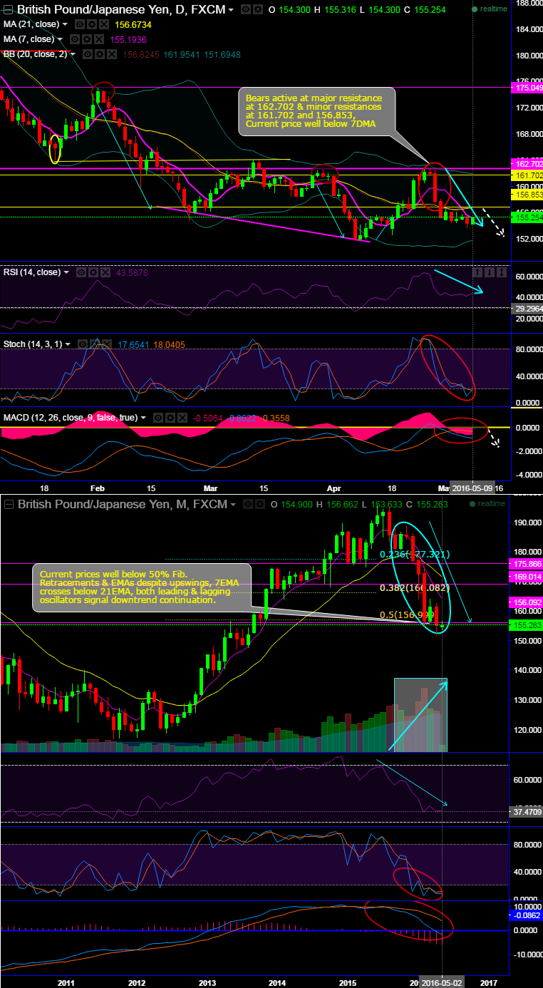 Bears resume after rejecting at major resistance at 162.702 & minor resistances at 161.702 and now at 156.853, as a result, the current price slid well below 7DMA and simultaneously the intermediate buying momentum seems disappeared.