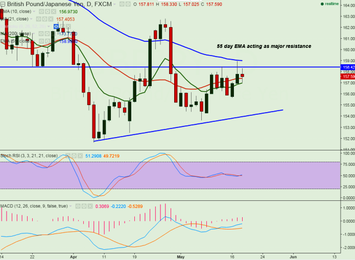 - On the higher side any break above minor resistance 159.05 (55 day EMA) will take the pair to next level till 160.35/161.70/162.70.