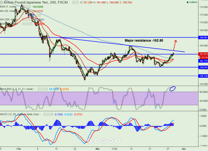- The pair has broken minor resistance 161.80 and jumped till 162.34 at the time of writing. It is currently trading around 162.18.