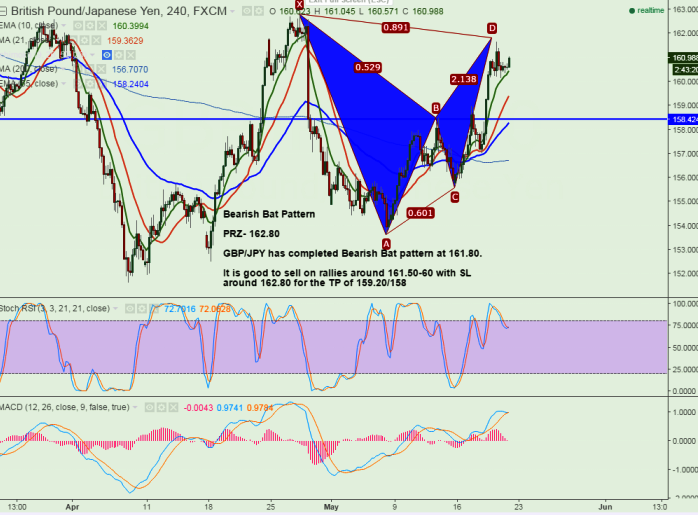 - GBP/JPY has completed Bearish Bat Pattern at 161.80 and slightly declined from that level. It is currently trading around 160.88.