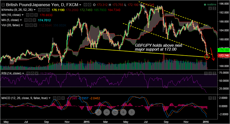 GBP/JPY broke major support at 174.20 in Wednesday's trade and edged lower.