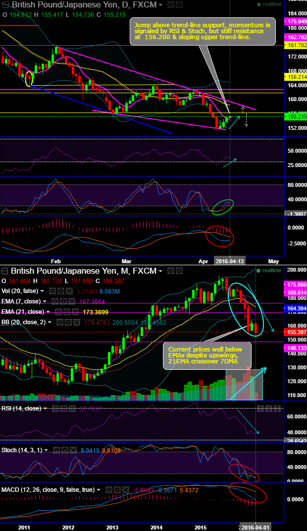 Daily price jump above trend-line support has momentum that is signalled by RSI & Stochastic oscillators, but MACD's bearish crossover and since the current prices have slid below 21DMA, we uphold the stiff resistance at 156.200, sloping upper trend-line & 21DMA too.