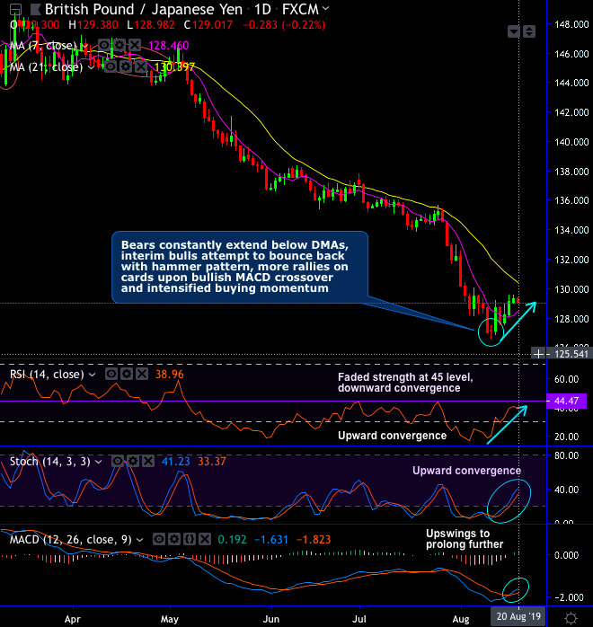 GBPJPY has occurred hammer pattern at 127.153 levels. Ever since then, mild buying sentiments are observed.