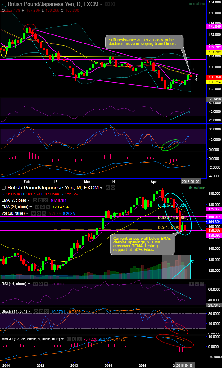 MACD's bearish crossover and since the current prices have slid below 21DMA, we uphold the stiff resistance at 156.200, sloping upper trend-line & 21DMA too.