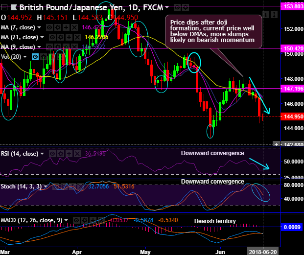 But for now, bears on weekly terms have managed to breach below channel support, consequently, the current price tumbles well below EMAs, but dragonfly doji occurs at 146.099 levels and shooting star pops up at 146.885 level to counter-rallies. Both leading as well as lagging indicators have been bearish bias (refer weekly chart).