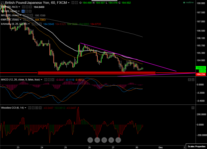 - GBP/JPY has slightly recovered till 184.90 after breaking major support 184.30. Overall trend is still weak as long as resistance 185 (trend line joining 185.77 and 185.31) holds.