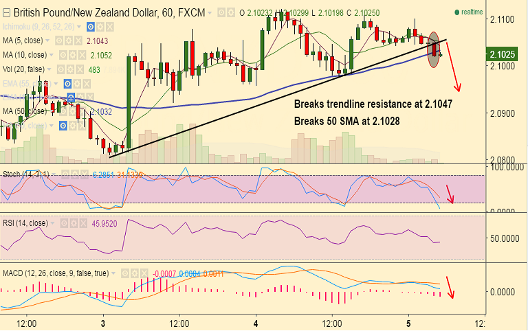 - The pair has broken major trend line support at 2.1047 on the hourly charts and has slipped below the 1H 50-SMA.