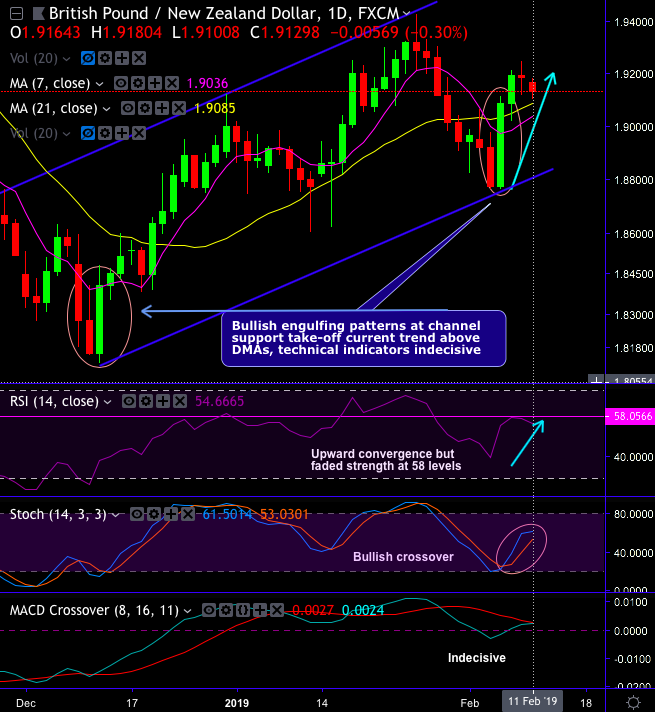 Technical analysis (chart and candlestick patterns occurred): On daily plotting, the pair has been spiking through ascending channel, bullish engulfing pattern candle has occurred at channel support. Consequently, bulls have taken-off the rallies above 21-DMAs.