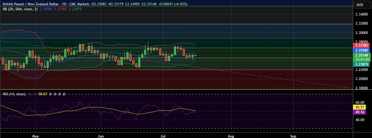 • Support is seen at 2.2461 (38.2%fib) and break below could take the pair towards 2.2391 (Lower BB).