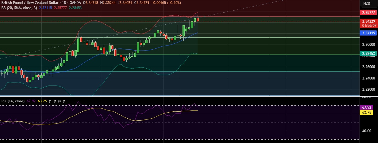 • Immediate resistance is located at 2.3508(23.6%fib), any close above will push the pair towards 2.3587(Higher BB).