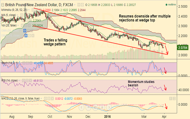 - GBP/NZD has been trading a falling wedge formation and has resumed downside after multiple rejections at wedge top.