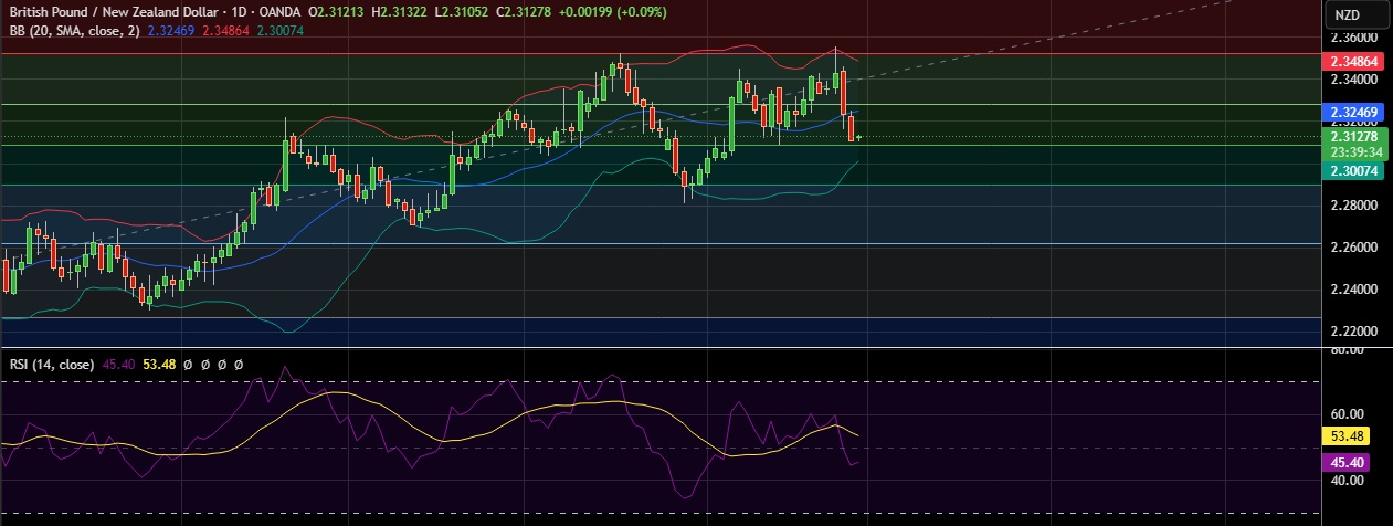 • Immediate support is seen at 2.3086 (50%fib) and break below could take the pair towards 2.3002 (Lower BB).