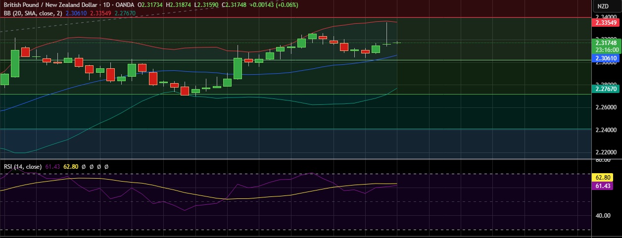 • Immediate resistance is located at 2.3353 (Higher BB), any close above will push the pair towards 2.3392 (23.6%fib).