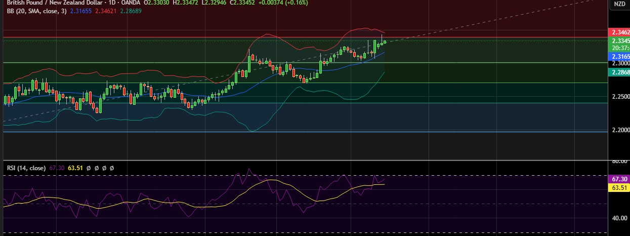 • Immediate resistance is located at 2.3351 (23.6%fib), any close above will push the pair towards 2.3428 (Higher BB).