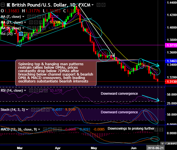 GBPUSD forms spinning top and hanging man patterns at 1.3422 and 1.3408 levels that restrain rallies below stiff resistance at 1.3463 levels and nudges prices below DMAs (refer daily chart).
