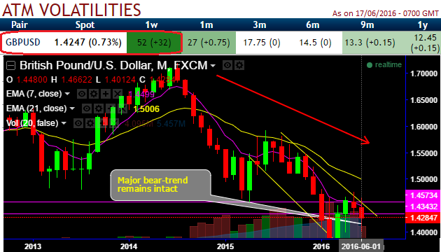 A Bremain scenario would involve the flash unwind of gamma positions and the lows reached would offer a unique opportunity to load volatility positions at discounted levels.