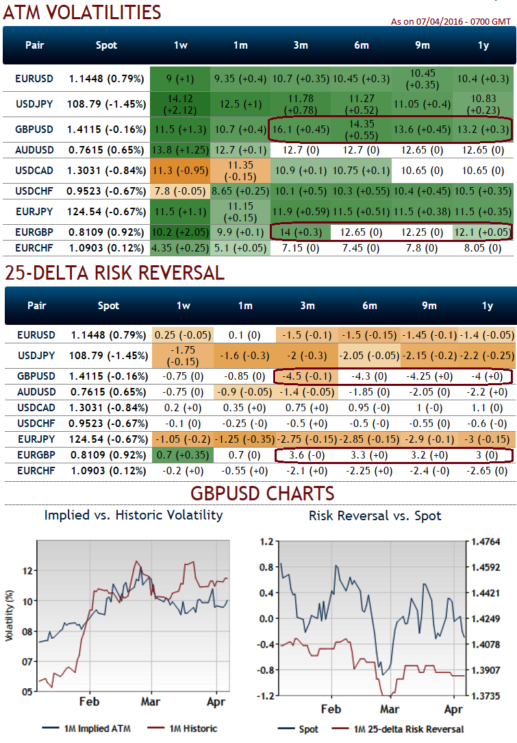 Brexit concerns sent euro/sterling 3-month implied volatility to 7-year high of 14%, (UK referendum scheduled on 23rd June which is approximately 2and half months from now).