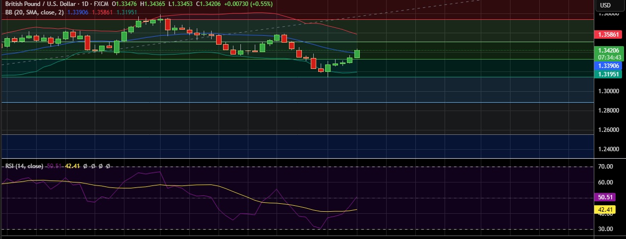 • Strong support is seen at 1.3390(SMA 20) and break below could take the pair towards 1.3324(50%fib).