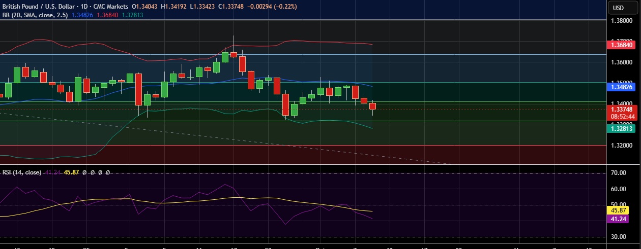 • Strong support is seen at 1.3321(38.2%fib) and break below could take the pair towards 1.3277(Lower BB).