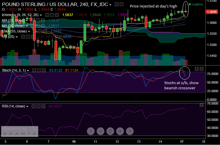 - GBP/USD hits day's high at 1.5688 into European open before edging lower, weakness seen in the near-term, Stochs point lower