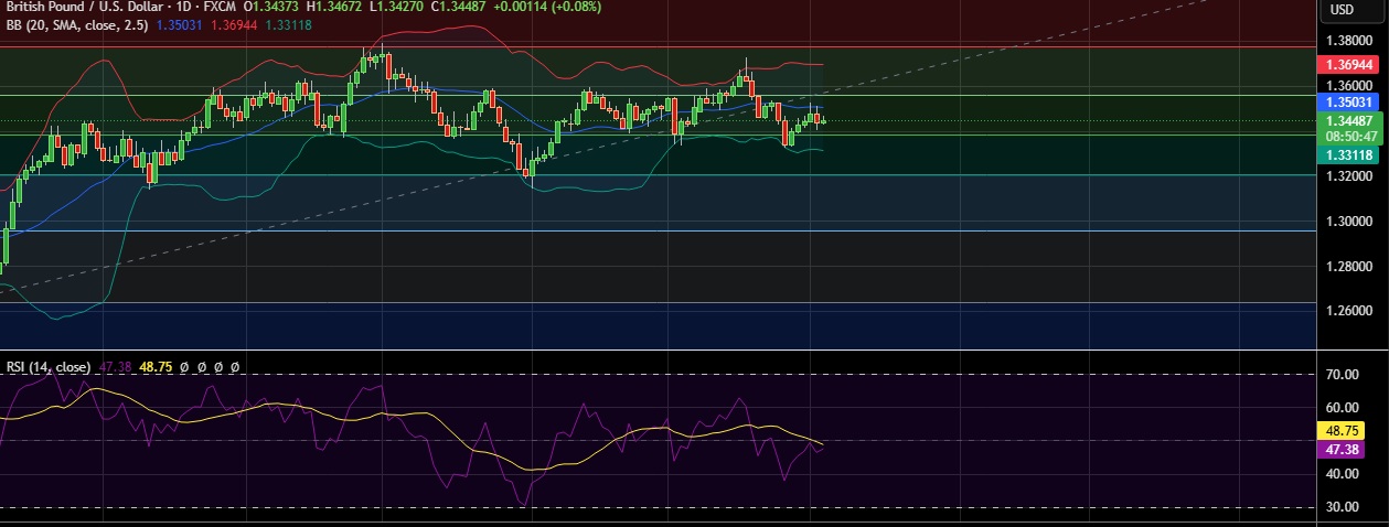 • Strong support is seen at 1.3378(50%fib) and break below could take the pair towards 1.3314(Lower BB).