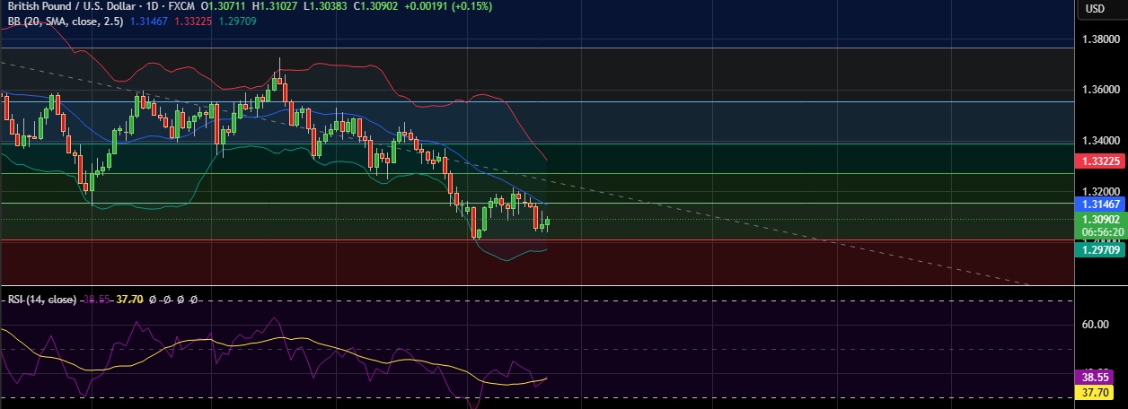 • Strong support is seen at 1.3017 (23.6%fib) and break below could take the pair towards 1.2975(Lower BB).