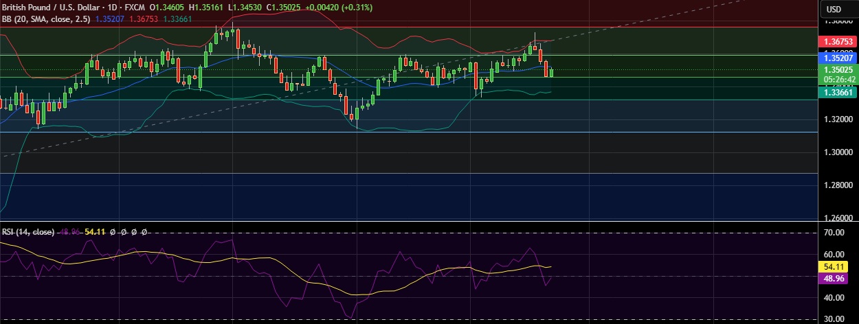 • Support is seen at 1.3457(50%fib) and break below could take the pair towards 1.3361(Lower BB).