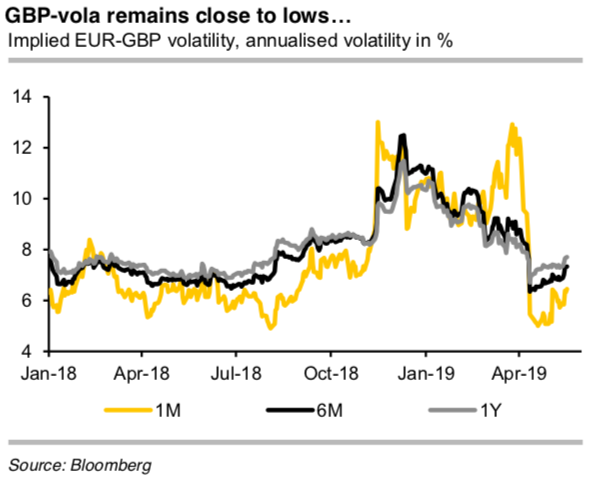 Under such circumstances, we reckon that it is completely incomprehensible why implied volatility both for the next month (until about a week after the vote) and longer term until after the Brexit date at the end of October remain close to last year’s low. It has always been interpreted the combination of low implied volatility (refer 1st & 4th chart) and nonetheless raised (long term) EURGBP risk reversals (refer 2nd & 3rd chart) that we had seen since Brexit was postponed as meaning that the market expects a long period without progress – hence the low vol – but doesn’t expect a deal as a deal would be GBP positive and would, therefore, point towards lower risk reversals; i.e. the market seems to expect a probably continued Brexit delay.