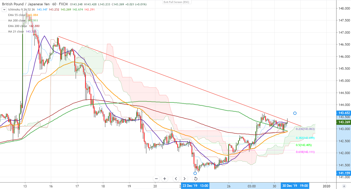 On the flip side, major intraday support is around 142.90 (200- H MA) and the break below will drag the pair down till 142.11 (61.8% fib)/141.20.