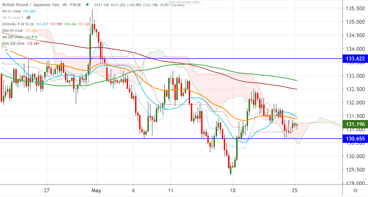 In the 4 hours chart it should close above 131.60 (Kijun-Sen) for further jump till 132/132.50. Any indicative break above targets 133.19 (May 11th high). The surge past 133.20 will take the pair till cloud top 134.47.