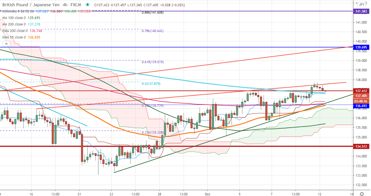 The pair is trading above 200- 4H MA, any indicative break above 137.87 (50% fib) confirm bullish continuation. A jump till 139.01 (61.8% fib)/140. It is facing strong support at 136.80, any indicative below that level targets 136.20/135.80/135/134.60/134/133.