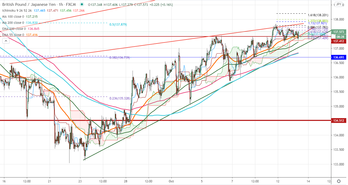 GBPJPY is trading in a narrow range between 137.84 and 137.22 for the past two days. The pound sterling lost more than 40 pips after mixed UK jobs data. The Claimant count came at 28000 less than the estimate of 78000, unemployment at 4.5% vs forecast of 4.3%. The renewed optimism on UK-EU trade negotiations is supporting GBPUSD at lower levels. The short term trend of GBPJPY is slightly bullish as long as support 136.80 holds.