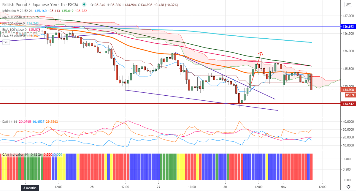 GBPJPY's upside capped by 100-EMA and shown a minor decline in the weak Pound sterling. The rise in the number of coronavirus cases in the UK and new 4-week lockdown across England. The intraday trend is still neutral as long as resistance 135.62 holds. The pound sterling is trading weak and trading slightly below 100-day EMA. A dip till 1.2800 is possible.