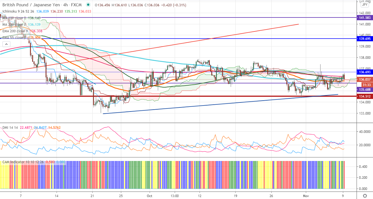 GBPJPY is trading slightly lower on the declining Pound sterling. GBPUSD lost more than 50 pips on profit booking. The pair gained a lot on broad-based US dollar selling after Biden was announced as US President. The Brexit optimism and chance of BOE to provide stimulus to support the economy are supporting Pound sterling at lower levels. The intraday trend is slightly bullish as long as support 135.50 holds.