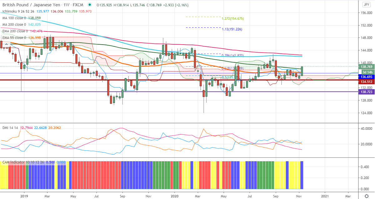 In the Weekly chart, GBPJPY is trading slightly above 100 MA and any convincing close above 138.05 will take the pair till 140/142.50. On the lower side, near term intraday support is around 137.80, and any indicative break below that level targets 137/135.95/135.37/135.20/134.80/134.