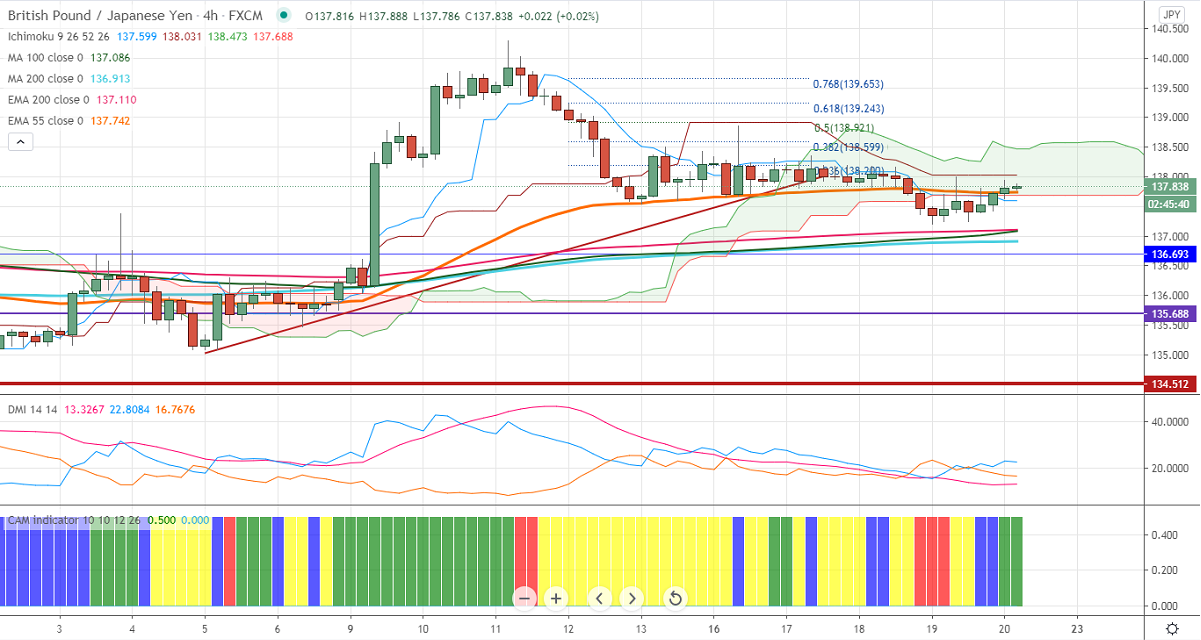 In the 4-hour chart, GBPJPY is facing strong support at 136.89 (200- EMA), and any convincing break below targets 136/135. On the higher side, near term intraday resistance is around 138, and any indicative break above that level targets 138.60/139.