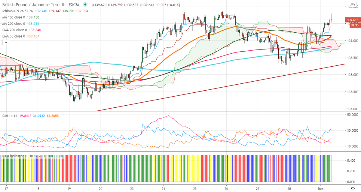 GBPJPY has recovered nearly 150 pips from a low of 138.28 on the strong Pound sterling. GBPUSD is inching towards 1.3400 levels on hopes of a Brexit deal by next week and broad based US dollar selling. Markets eye UK final manufacturing PMI data for further direction. The intraday trend of GBPJPY is bullish as long as 138 holds. USDJPY continues to trade weak after forming a minor top at 104.76.