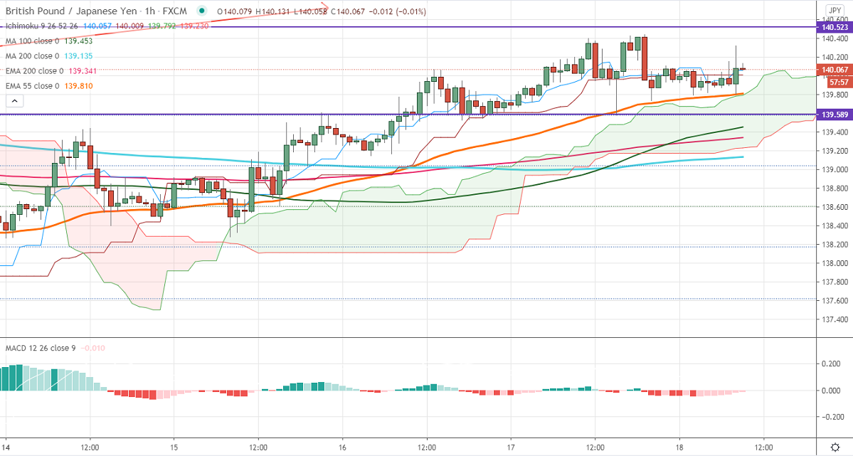 GBPJPY is consolidating in a narrow range after hitting a high of 140.44. The pound sterling paired some of its gains after UK PM Boris Johnson's pessimistic view on the Brexit deal. GBPUSD lost more than 100 pips from a high of 1.36228. UK retail sales came at -3.8% MoM slightly better than anticipated -4.2%. The intraday trend of GBPJPY is bullish as long as resistance 139.50 holds.