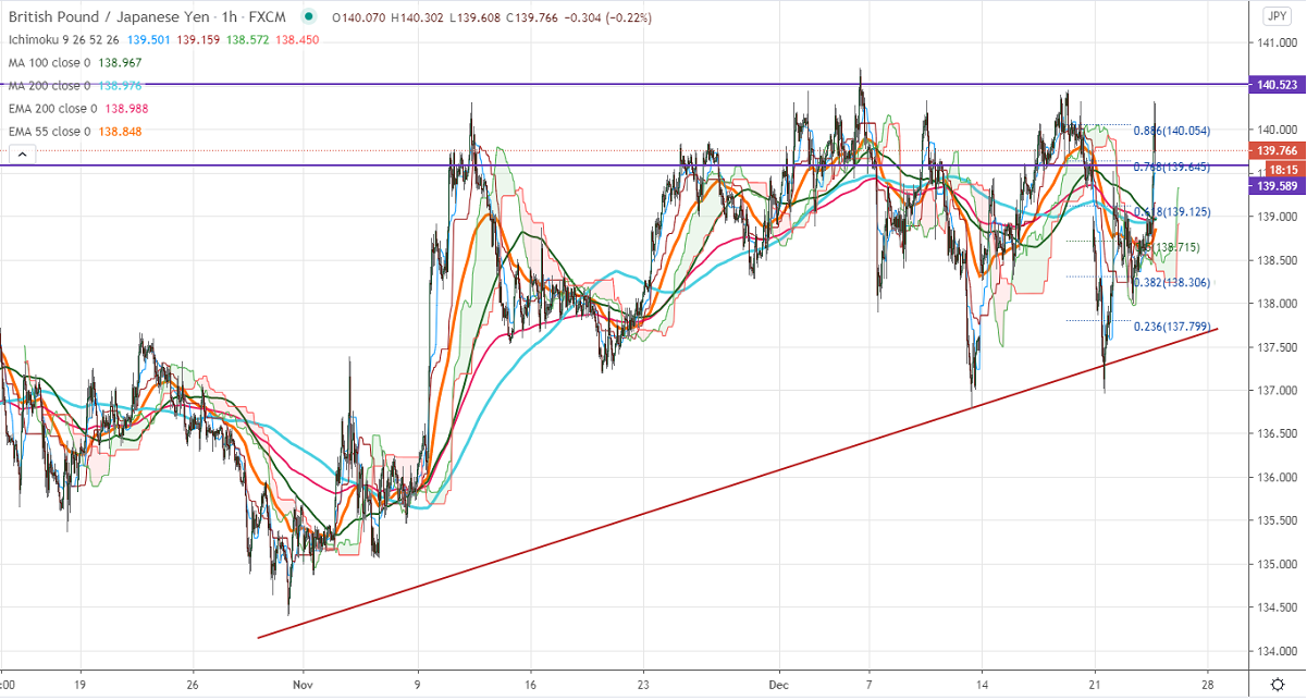 GBPJPY has shown a minor recovery from a low of 138. The jump in pound sterling against USD was mainly due to the possibility of a Brexit deal. GBPUSD is holding above 1.3400, any violation above 1.35000 confirms trend continuation. Markets eye Brexit talks and virus update for further direction. The intraday trend of GBPJPY is bullish as long as support 137.96 holds.