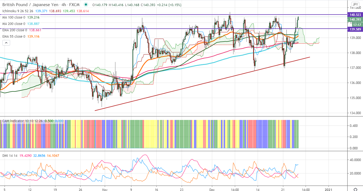 GBPJPY hits one week high on Brexit deal optimism. The UK and EU are nearing a deal after long negotiations. The deal is expected to be announced today on Christmas eve, according to UK government sources. GBPUSD trades above 1.3500 levels, any violation above 1.3625 confirms significant bullishness. The intraday trend of GBPJPY is bullish as long as support 139.50 holds.