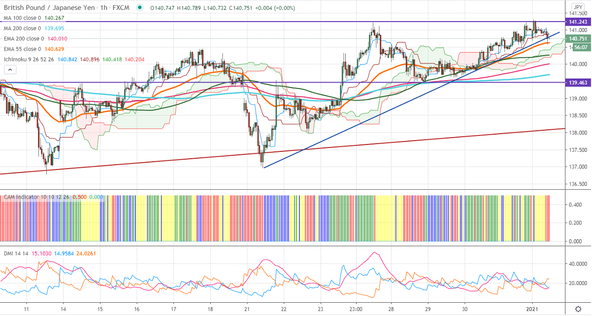 GBPJPY is holding above 140 levels on the strong pound sterling. GBPUSD hits a multi-month high after the EU and UK reached a Brexit deal the previous week. Markets eye UK Final Manufacturing PMI for further direction. The intraday trend of GBPJPY is bullish as long as support 139.68 holds.