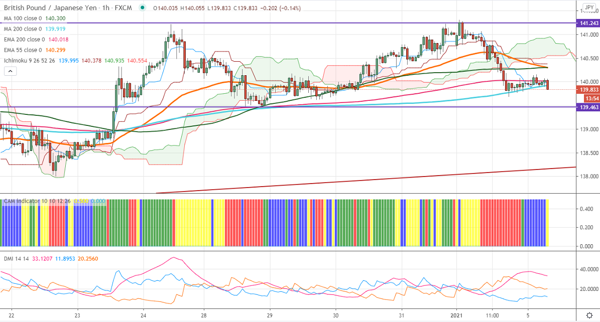 GBPJPY declined sharply after forming a double top near 141.20 levels. The decline was mainly due to weakness in the Pound sterling on lockdown worries. GBPUSD lost more than 150 pips from a high of 1.37030. UK Final PMI came at 57.5 in Dec compared to an estimate of 57.30. The intraday trend of GBPJPY is neutral as long as support 139.40 holds.