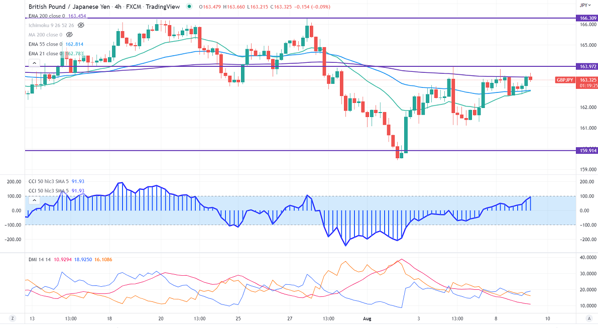 GBPJPY trades in a narrow range between 163.97 and 161.15 for the past three days. The minor profit booking in pound sterling puts pressure on the pair at higher levels. The Brexit pessimism and political uncertainty cap cable upside. USDJPY pared some of its gains made the previous week. Technically in the 4-hour chart, the pair is holding above short-term 21-EMA, above 55 EMA, and below long-term 200 EMA (163.45). Any violation above 164 will take to next level 165.25/166.20. GBPJPY hits an intraday high of 163.84 and is currently trading around 163.30.