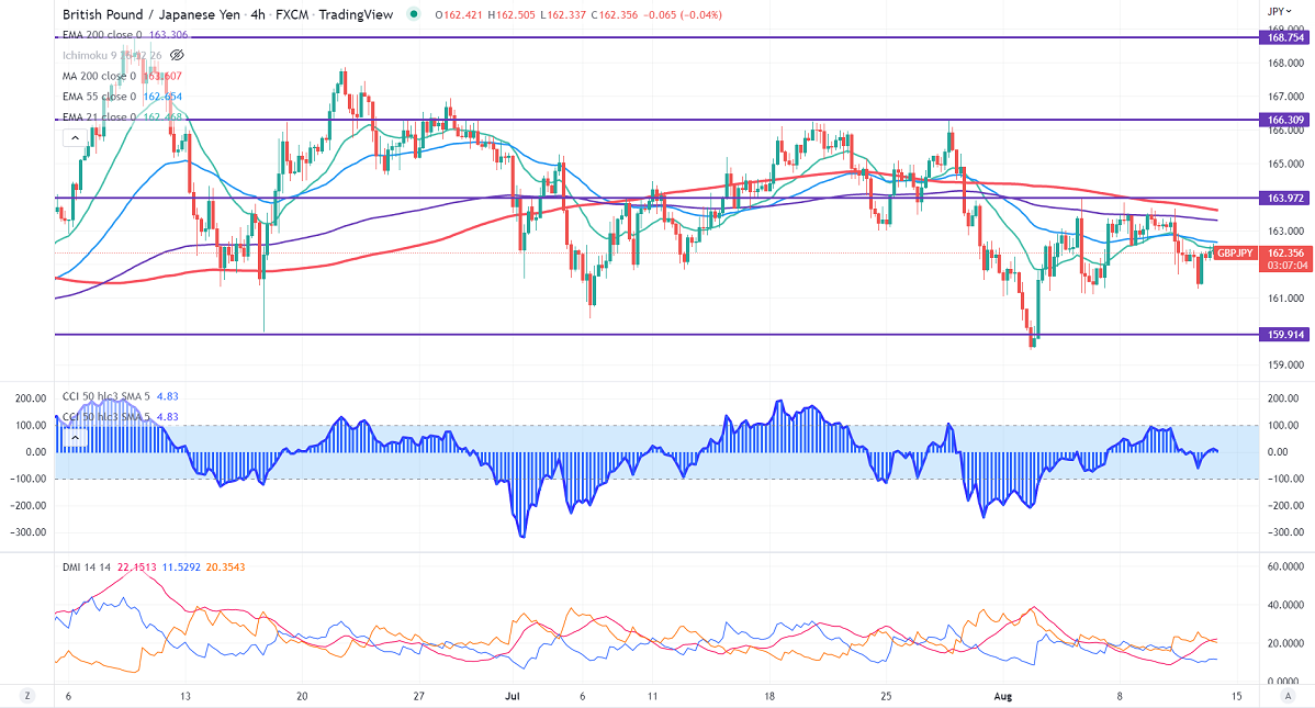 GBPJPY formed a double bottom around 161 and showed a minor pullback. Pound sterling holds above 1.2200 level ahead of UK GDP. Markets expect the UK economy to contract by 0.2% compared to 0.80% previous. Any close above 1.2300 confirms further bullishness.r lost its shine on the strong yen. US dollar tumbled sharply against all majors especially Pound sterling preventing the pair from further downside. Technically in the 4-hour chart, the pair is holding below short-term 21-EMA, 55 EMA, and long-term 200 EMA (163.316). Any violation above 162.80 takes to the next level 163.65/164. GBPJPY hits an intraday low of 161.68 and is currently trading around 162.13.